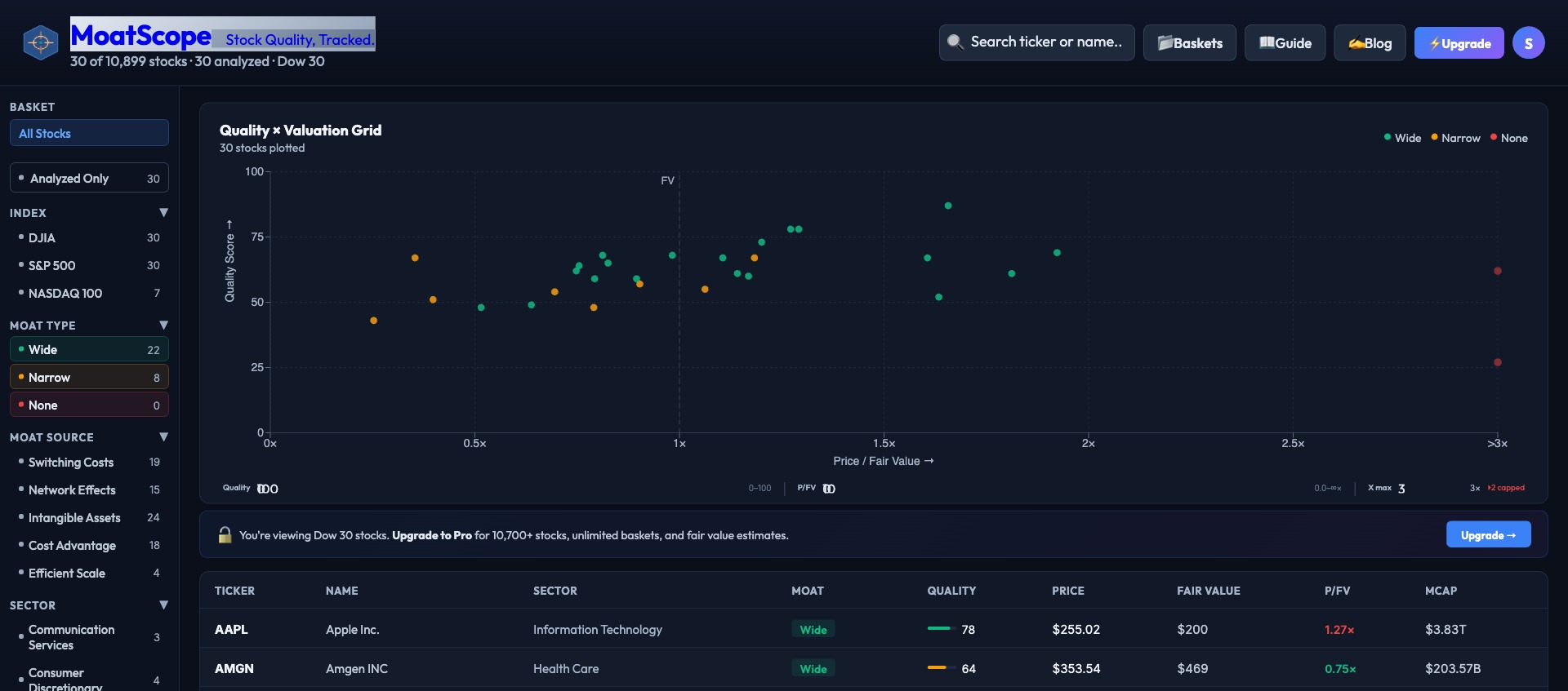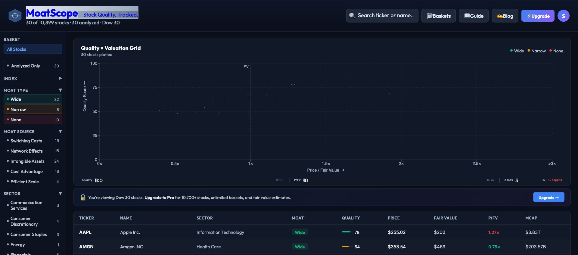MoatScope is a stock research platform built around one core idea: the best investments combine high business quality with reasonable valuation. We map every stock on a Quality × Valuation grid so you can instantly spot great businesses that the market may be underpricing.