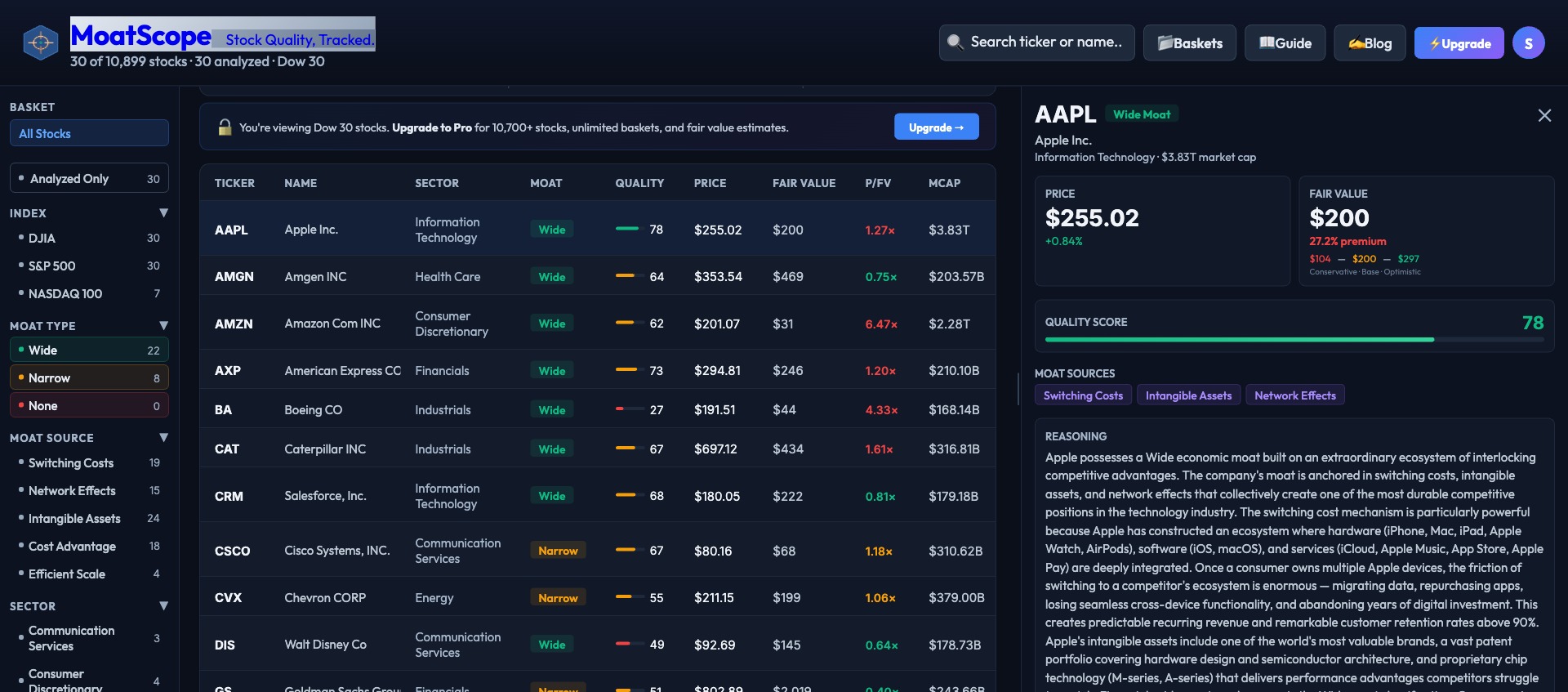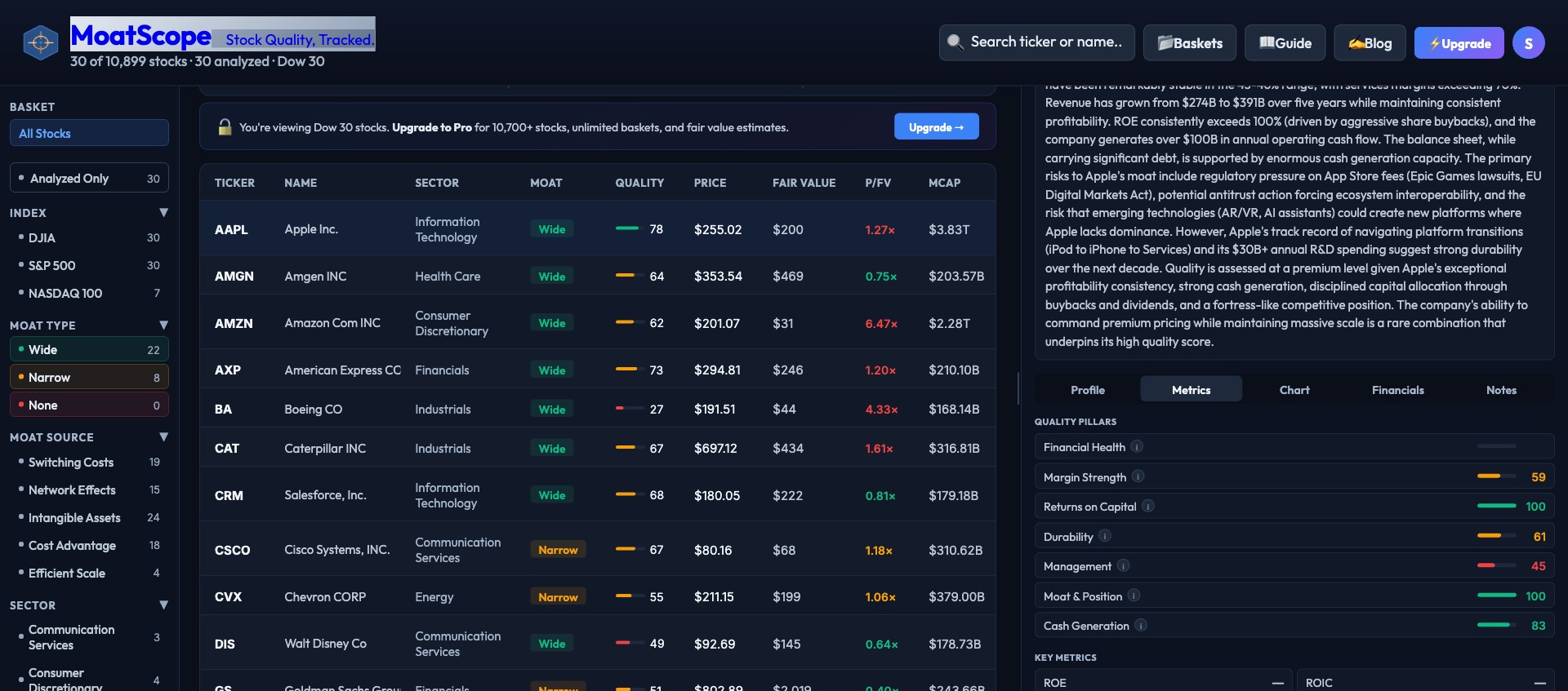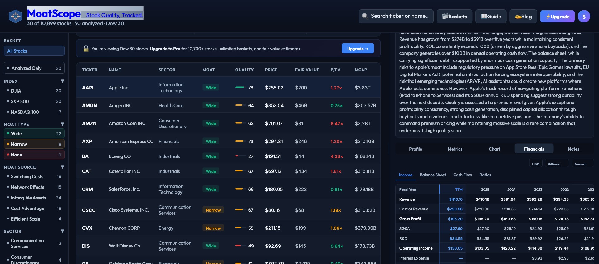 Unlike traditional stock screeners that flood you with raw data, MoatScope focuses on the interpretive layer — AI-powered moat analysis, a seven-pillar quality scoring system, and fair value estimates — to help you understand why a company is (or isn't) a high-quality business.